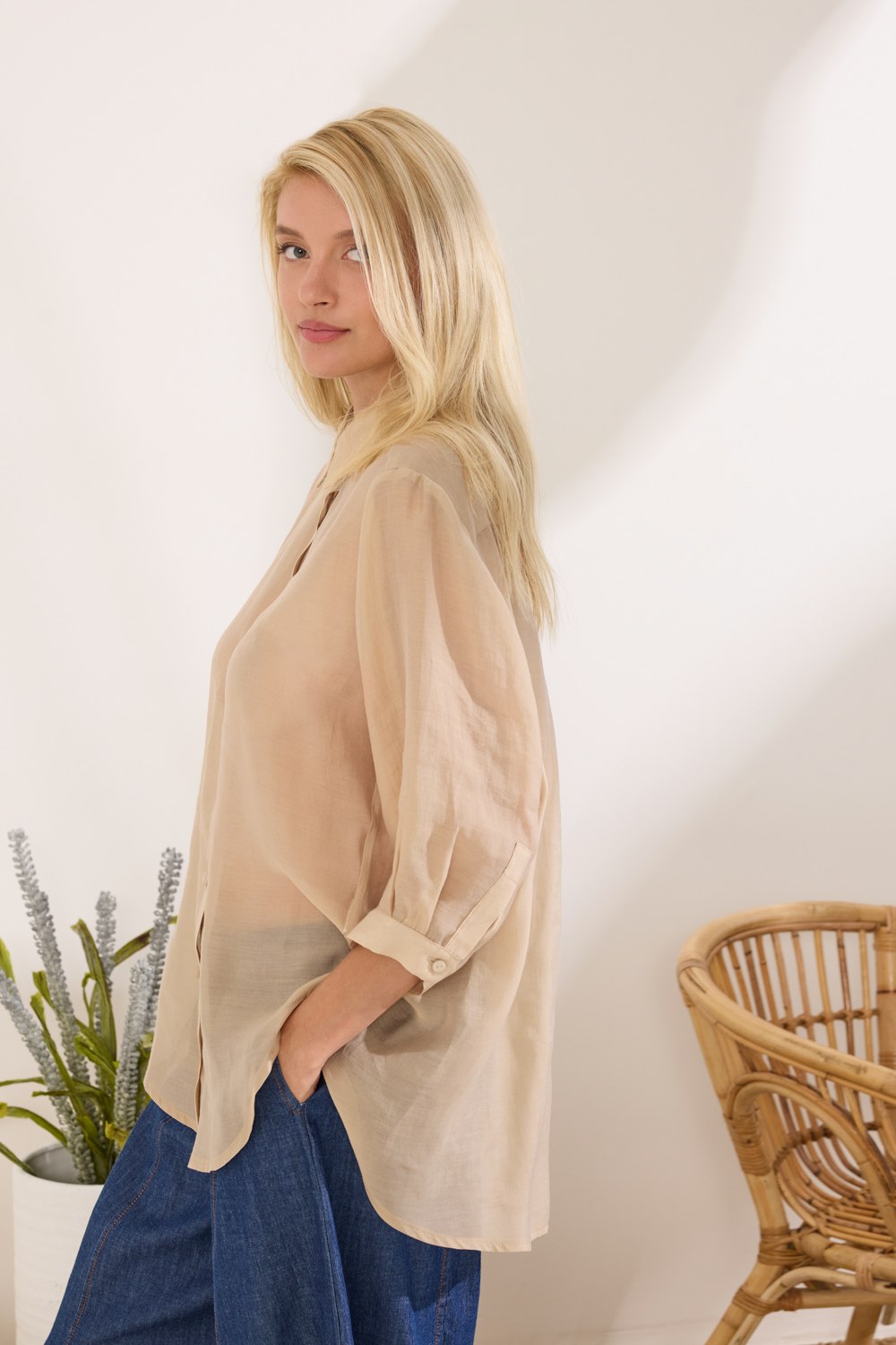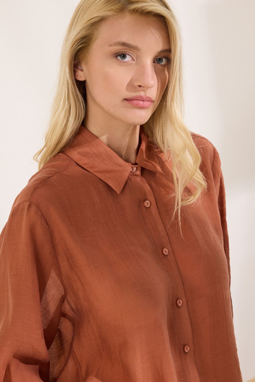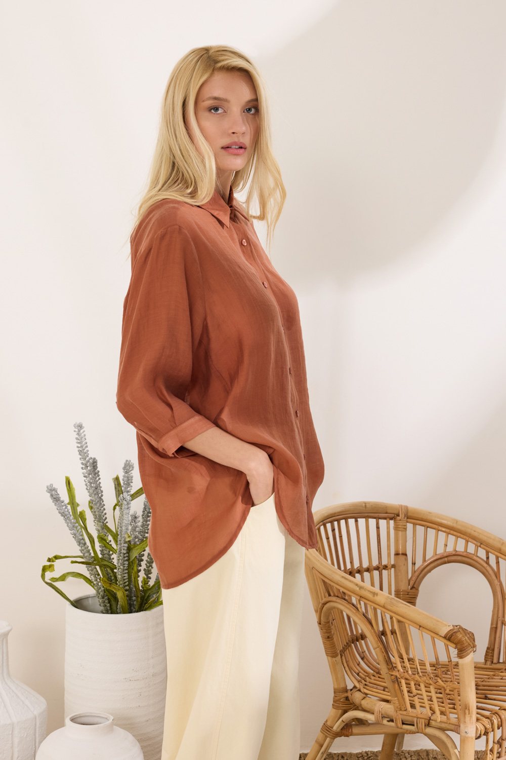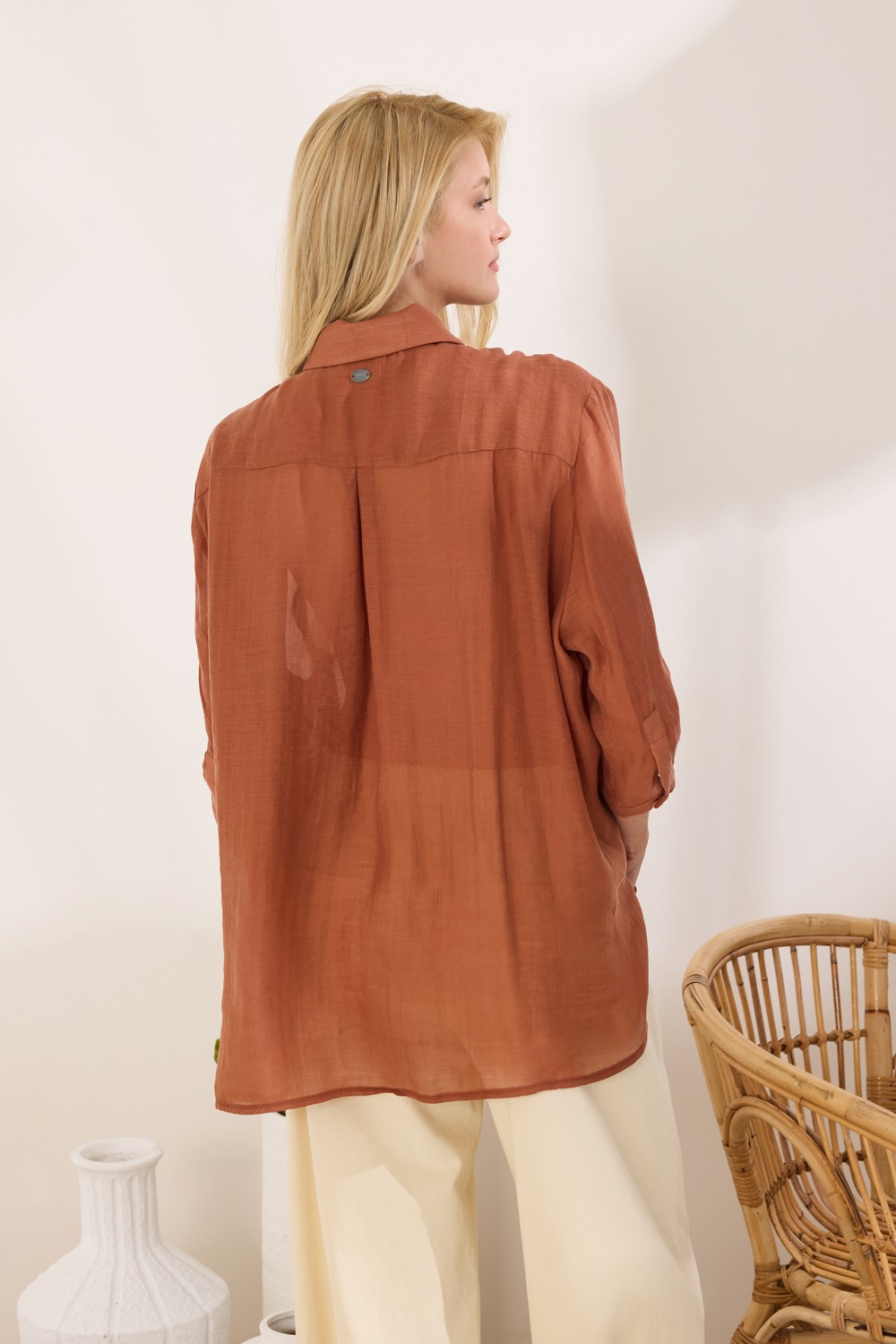 Πουκάμισο Oversized με τρουακάρ μανίκια και ασύμμετρο τελείωμα, που δημιουργεί μία σύγχρονη και άνετη γραμμή, ενώ το ύφασμα viscose προσφέρει απαλή υφή, αναδεικνύοντας την minimal αισθητική με μοντέρνο χαρακτήρα. “Αυτό το προϊόν έχει φτιαχτεί με αγάπη και σεβασμό στο περιβάλλον χρησιμοποιώντας φυσικές ίνες.