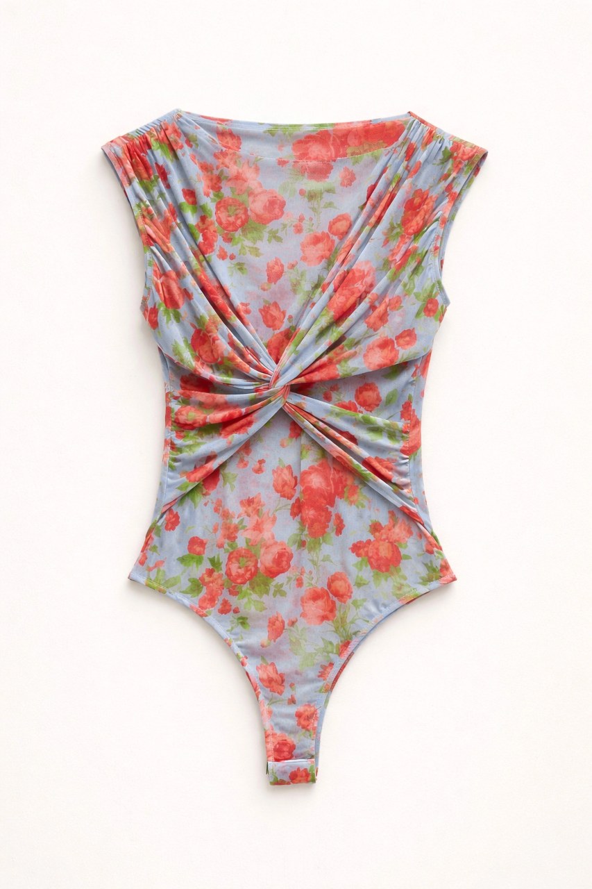 Εμπριμέ κορμάκι (body) σε ύφασμα τύπου τούλι. Φλοράλ τύπωμα σε όλη την επιφάνεια. Ιδιαίτερη ντραπέ λαιμόκοψη που σχηματίζει V.