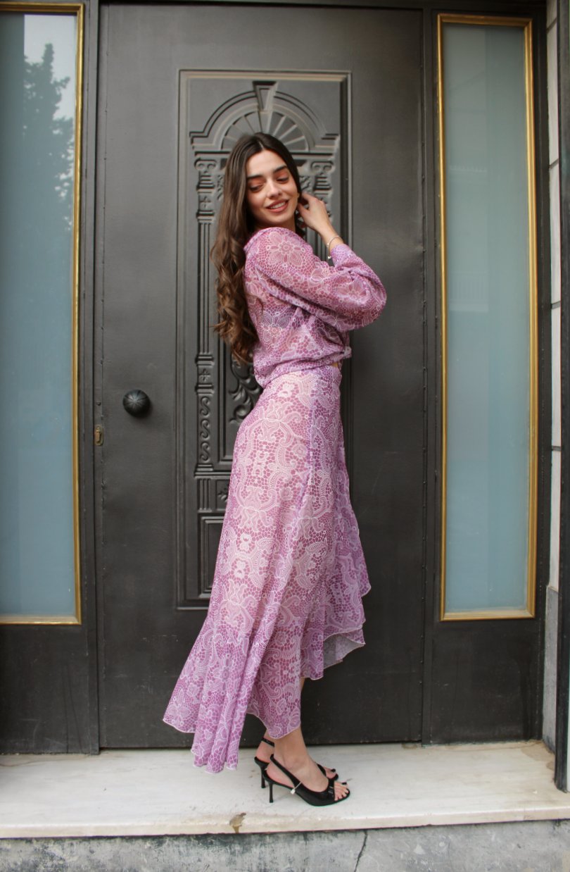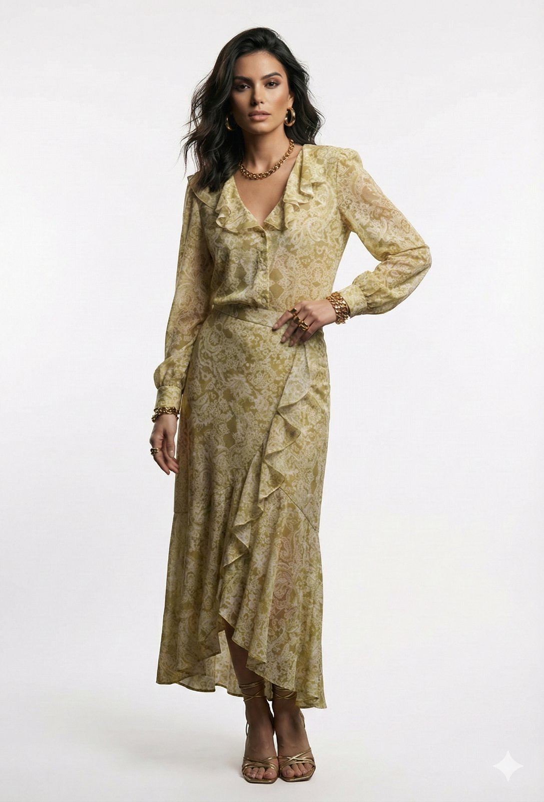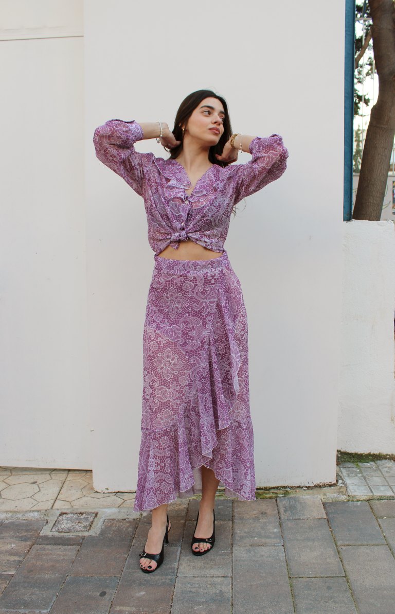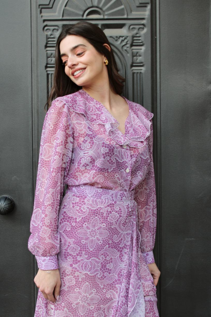 Εμπριμέ πουκάμισο σε ημιδιάφανο ύφασμα. Έχει V με βολάν και κλείνει μπροστά με κουμπιά.