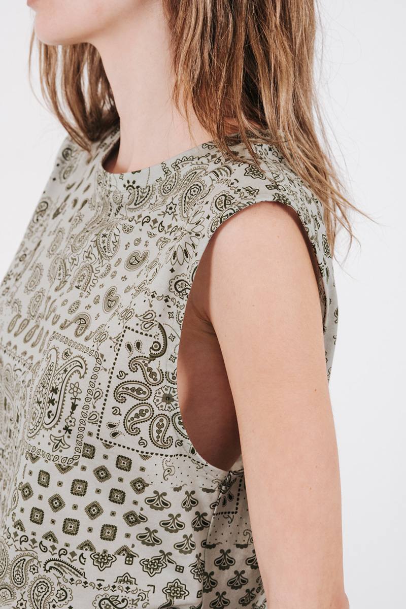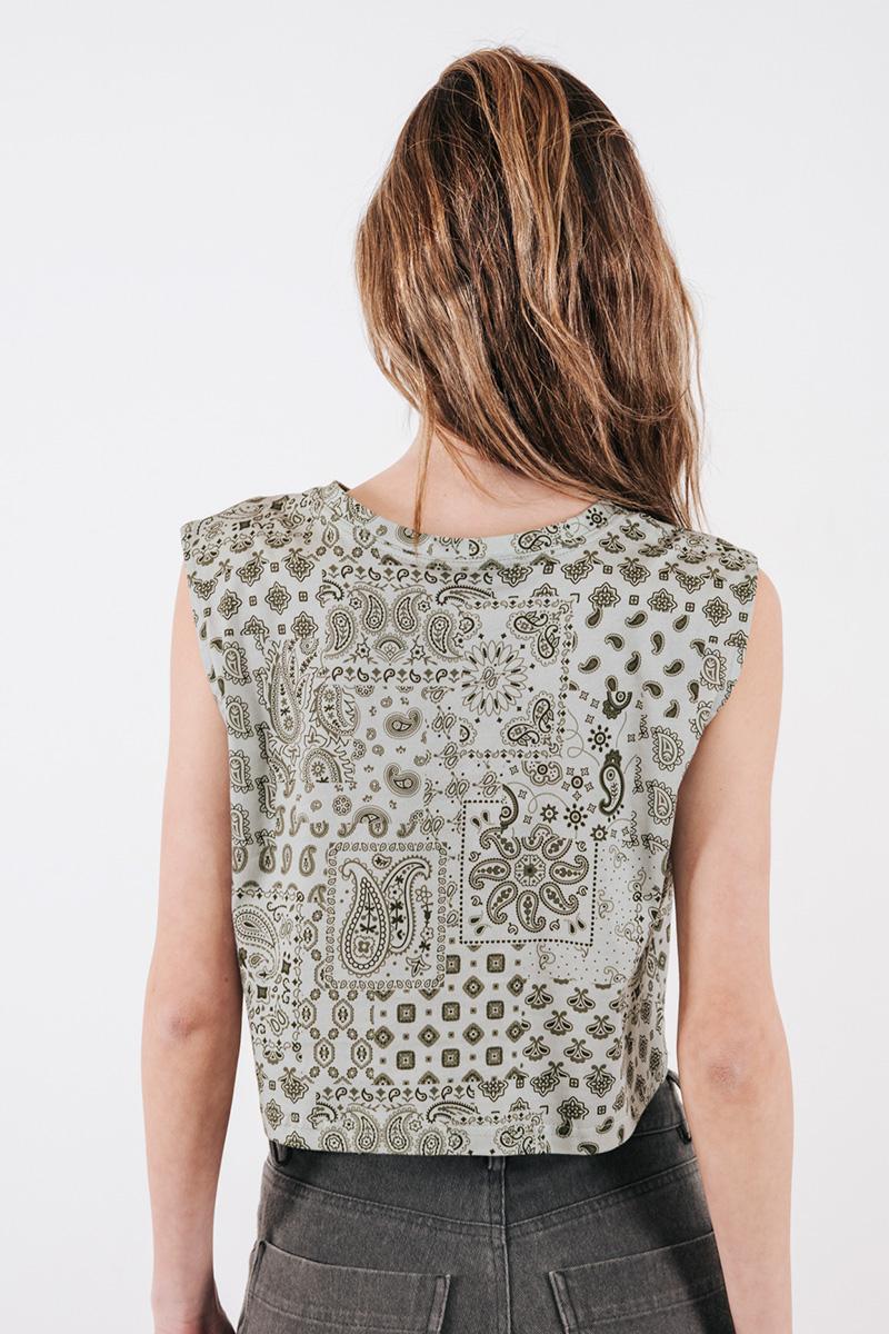 Αμάνικη εμπριμέ μπλούζα κοντή με στρογγυλή λαιμόκοψη.