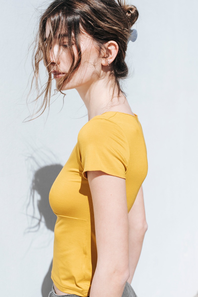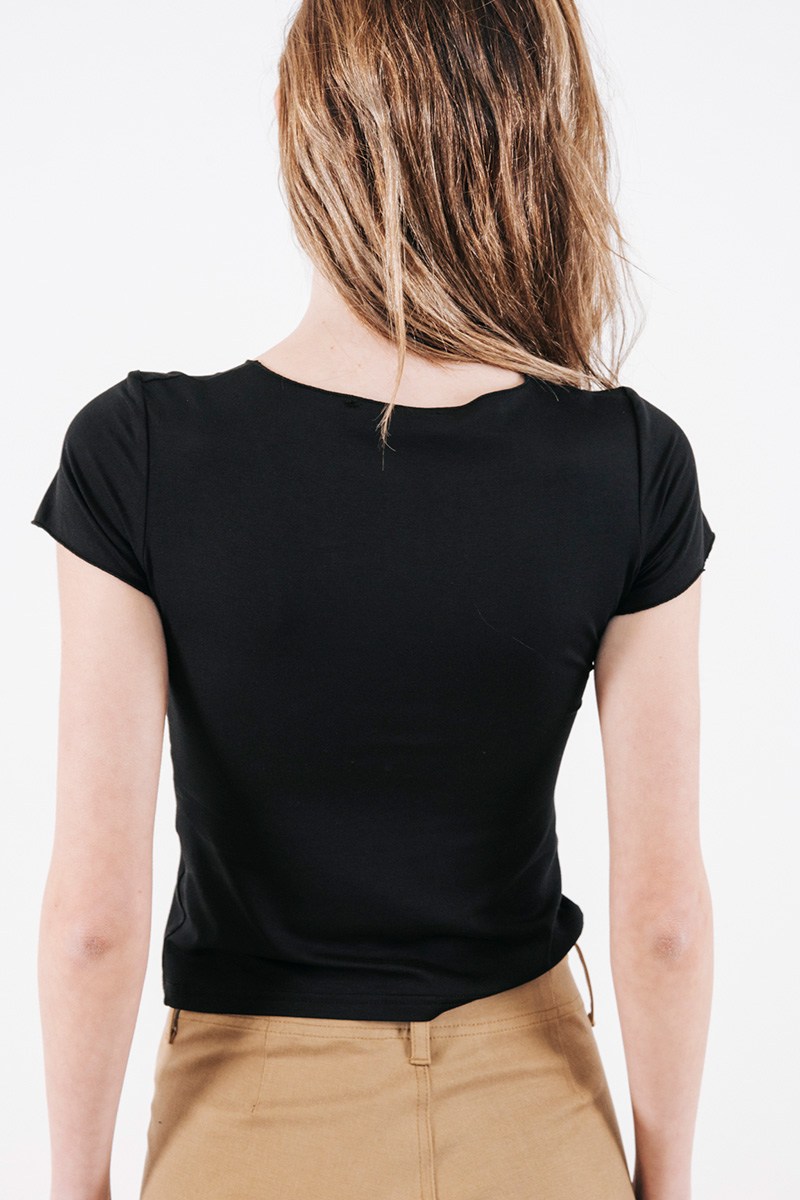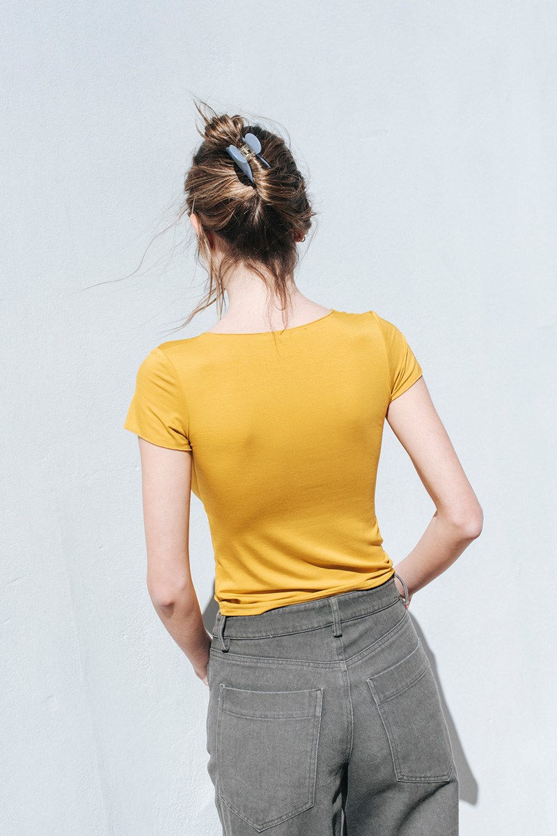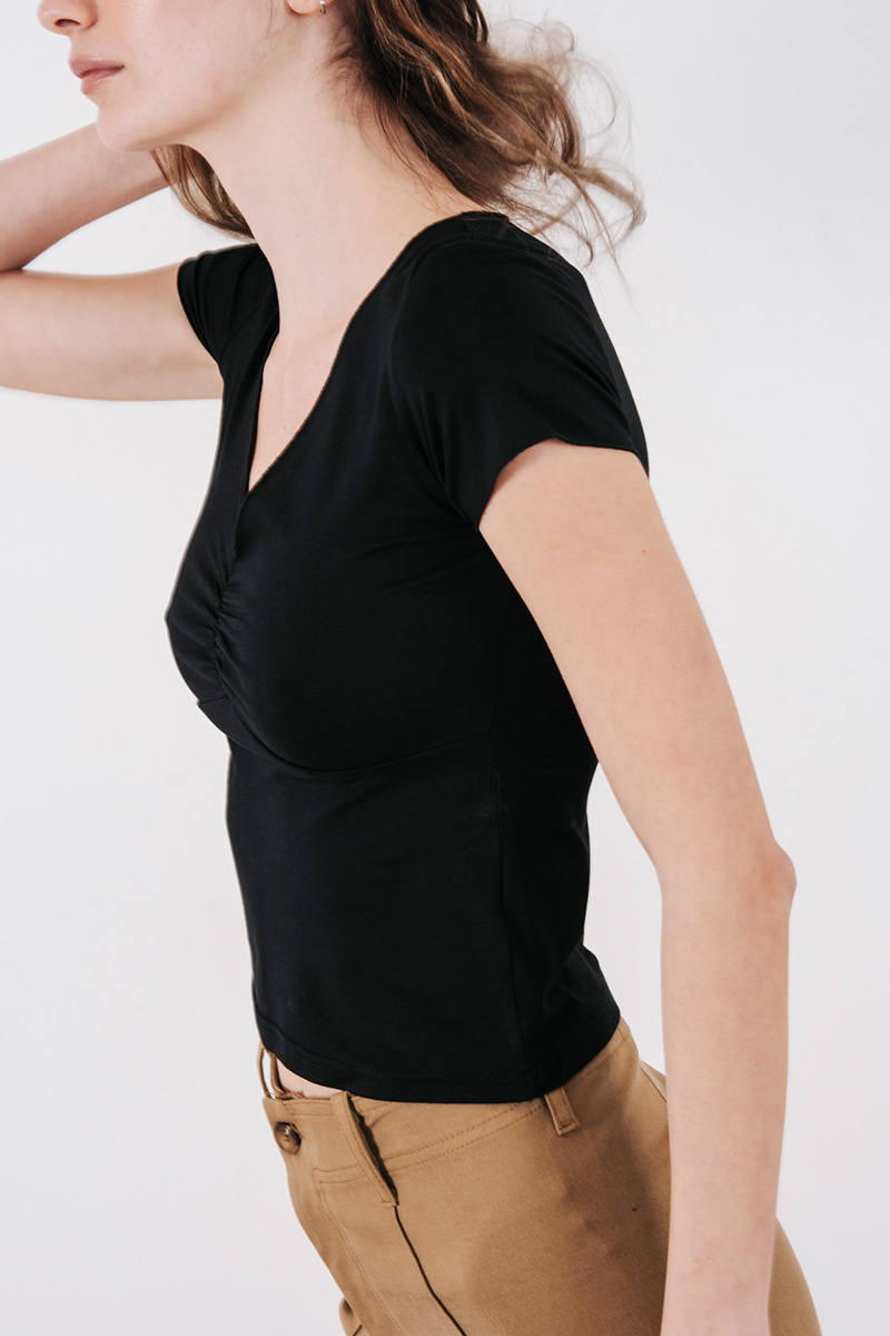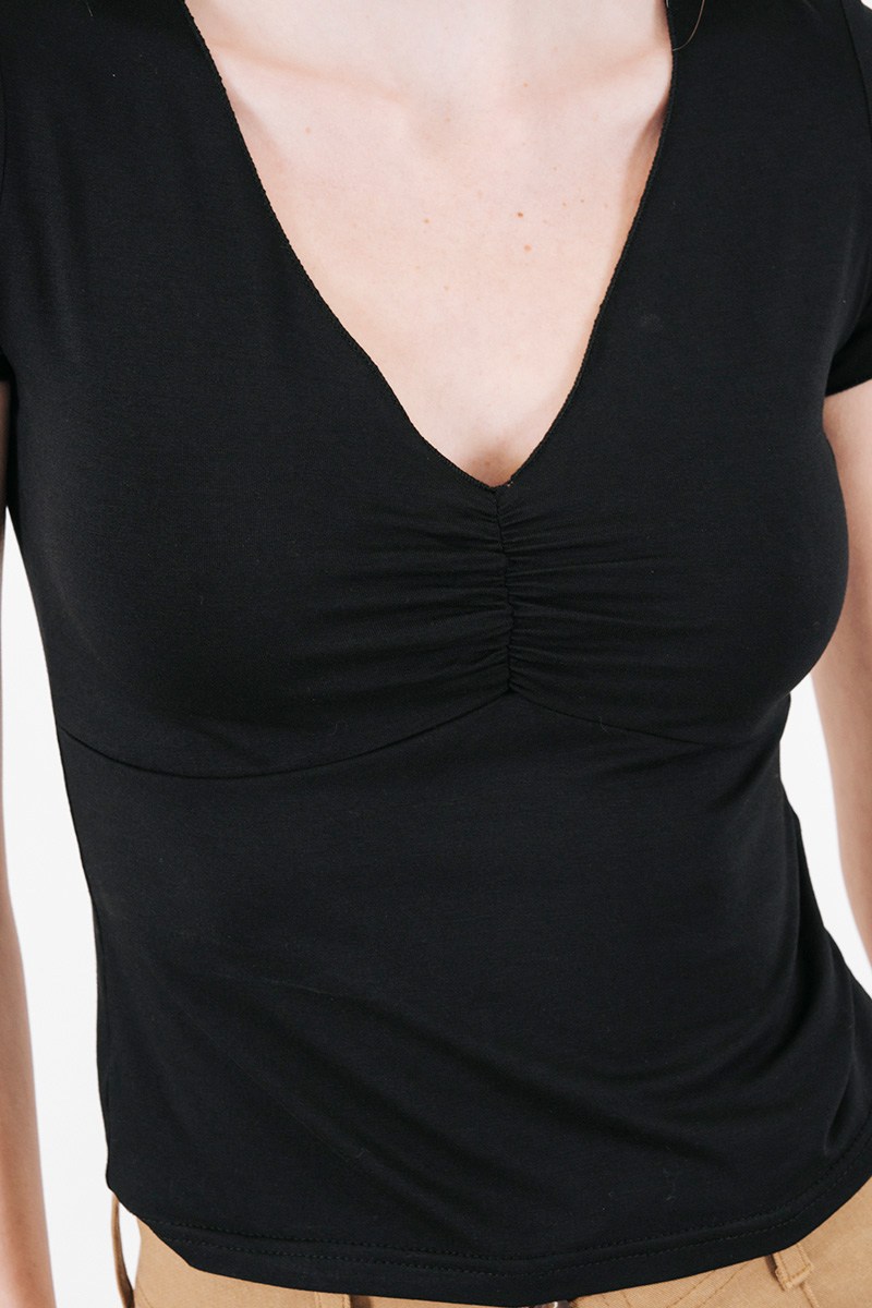 Κοντομάνικη μπλούζα με V λαιμόκοψη και σούρα στο ντεκολτέ.