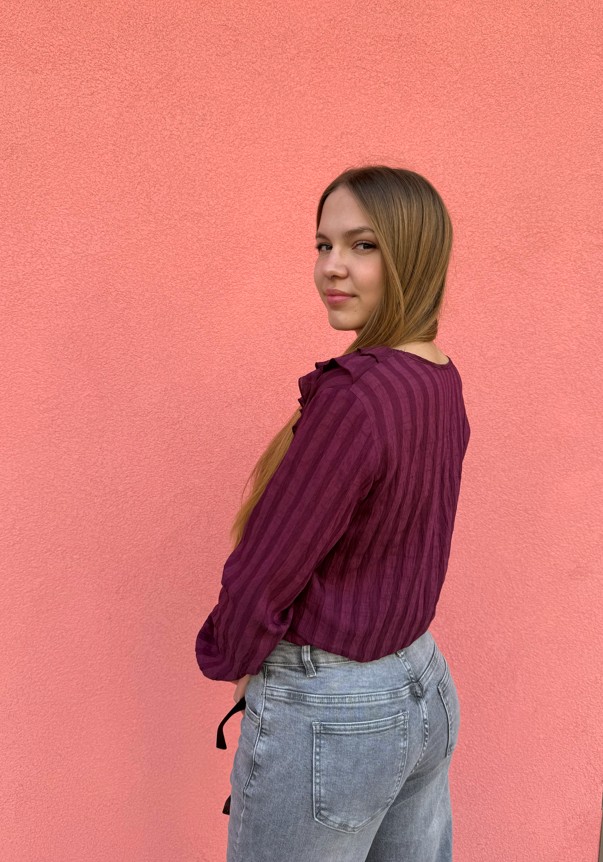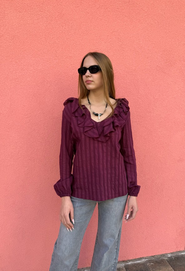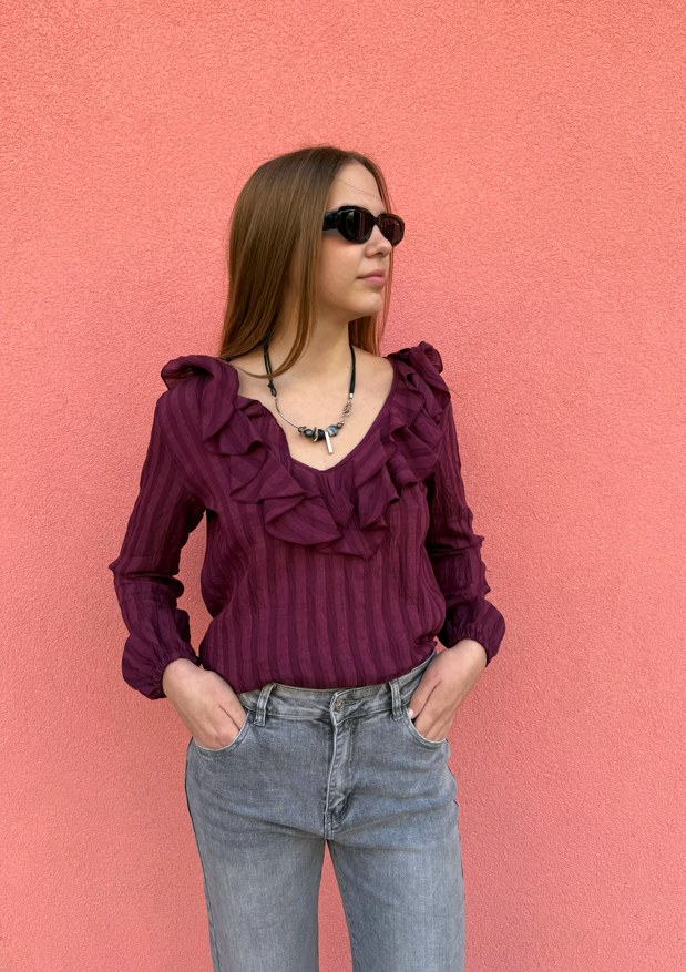 Μακρυμάνικη μπλούζα με μεγάλο V που διαθέτει δύο βολάν. Έχει λάστιχο στο τελείωμα των μανικιών. Το ύφασμα κάνει ρίγες στο ίδιο χρώμα.