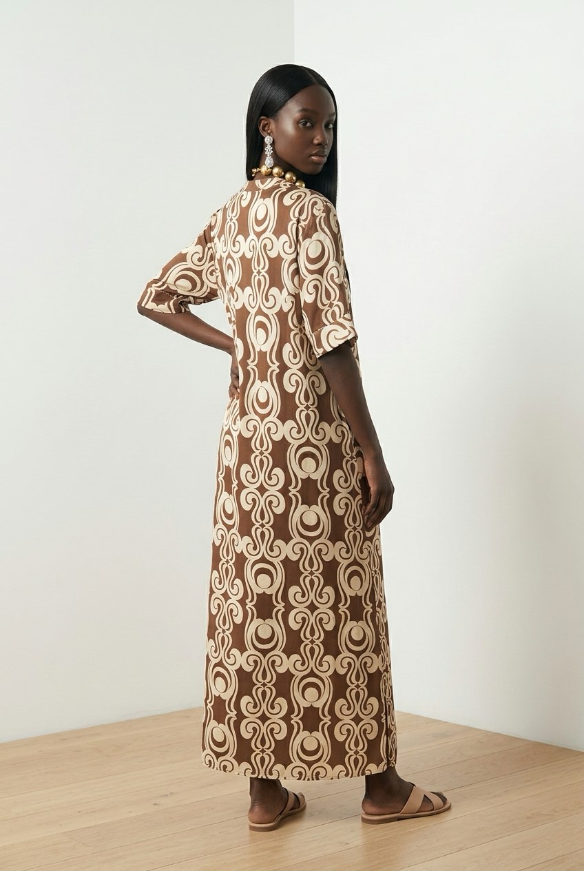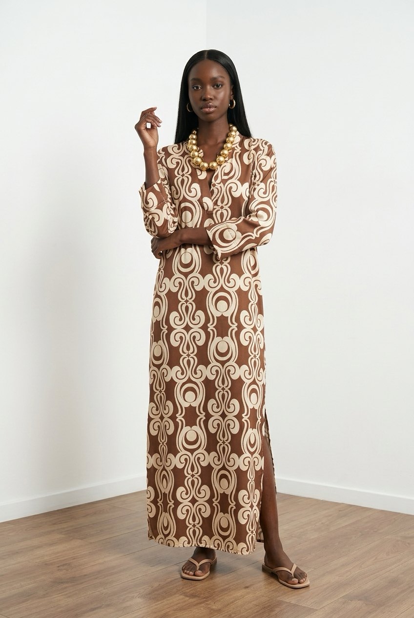 Μακρύ εμπριμέ σατέν φόρεμα-καφτάνι σε ίσια γραμμή με δύο σκισίματα στο πλάι και μάο γιακά.