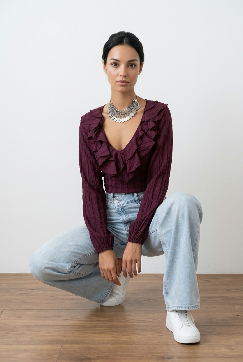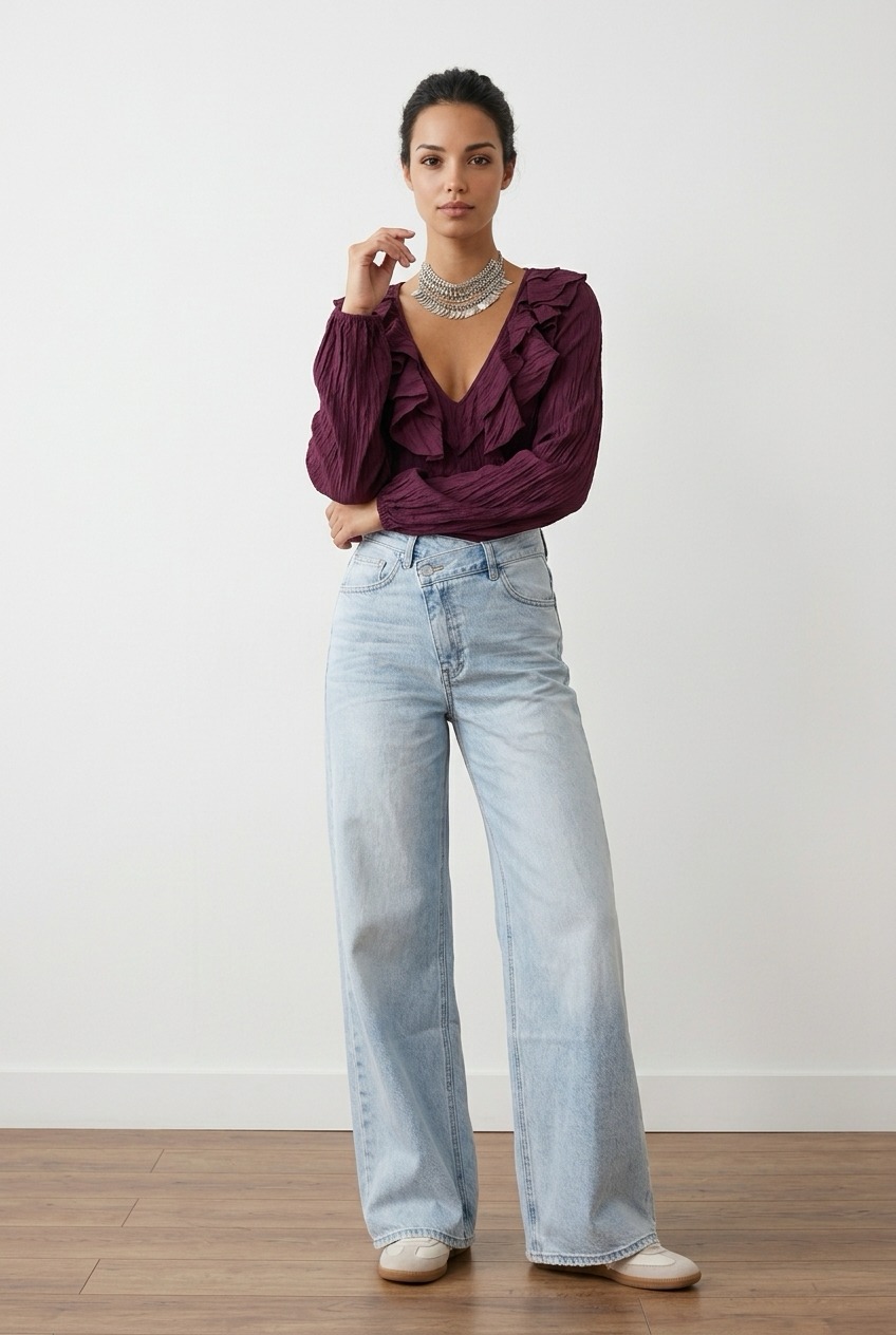 Πεντάτσεπη ισόφαρδη τζιν παντελόνα που κλείνει μπροστά με φερμουάρ και κουμπί, σε λοξό κούμπωμα.