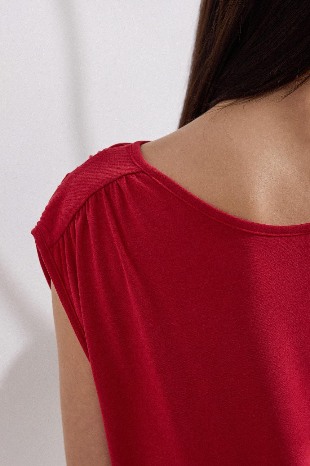 Μπλούζα σε άνετη γραμμή με ασύμμετρη λαιμόκοψη που πέφτει απαλά στον έναν ώμο, ενώ στον άλλον σχηματίζονται σούρες που προσθέτουν διακριτική ένταση. Αμάνικη, με άνοιγμα στο πλάι που τονίζει τη γραμμή του σχεδίου.